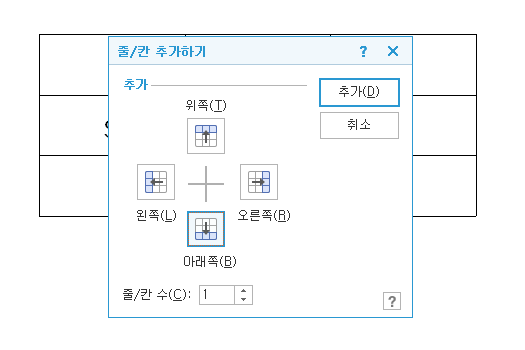 수는 말 그대로 몇 개의 줄이나 칸을 추가할지 입력하는 것이죠.