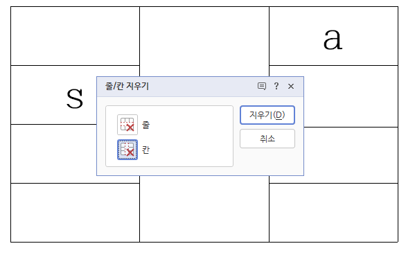 줄을 삭제할 지, 칸을 삭제할지만 선택하면 됩니다.