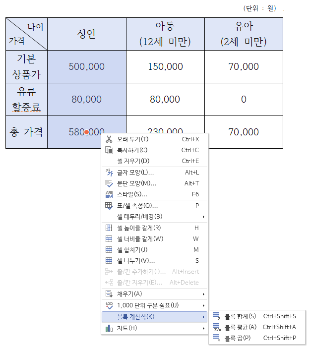 이렇게 마우스 오른쪽 클릭에서 블록 계산식을 선택할 수도 있어요.