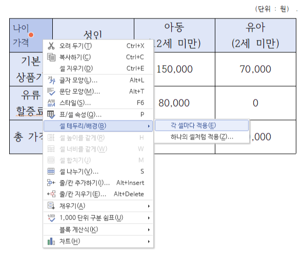 '셀 테두리/배경' - '각 셀마다 적용'으로 들어가줍니다.