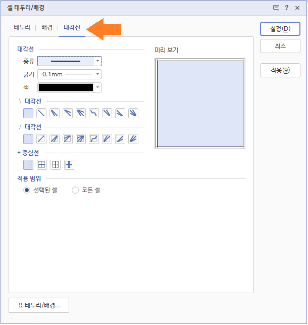 대각선을 넣고 싶은 칸에서 마우스 오른쪽 버튼을 클릭하고
