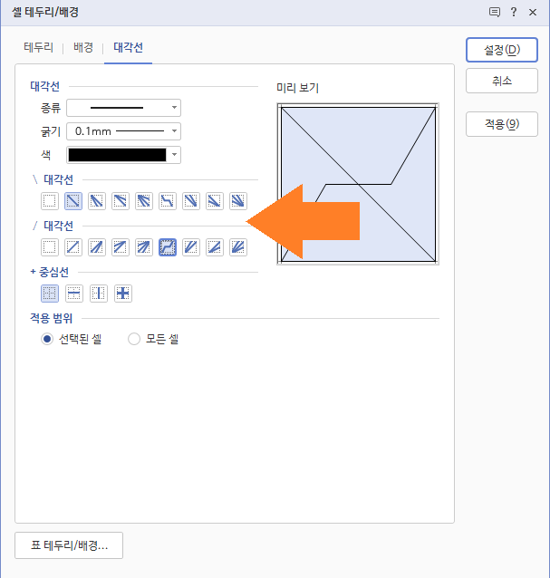 중간에 대각선과 중심선을 선택할 수 있는 버튼들이 있습니다.