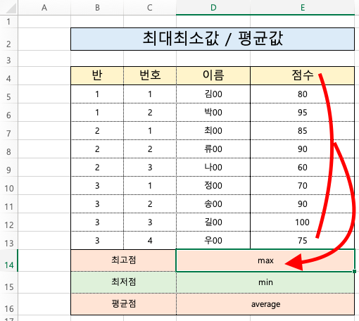 먼저 함수 이름인 max를 입력하고 인수란에는 점수 목록을 적어줄게요.