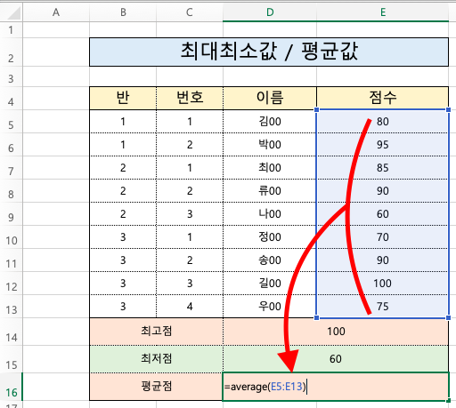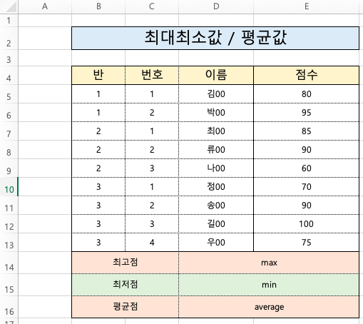 이번엔 최솟값 함수인 min을 입력하고 인수자리에는 아까와 동일하게 점수 목록을 넣었어요.