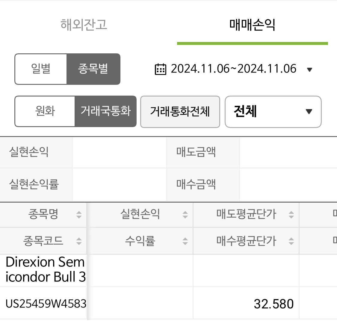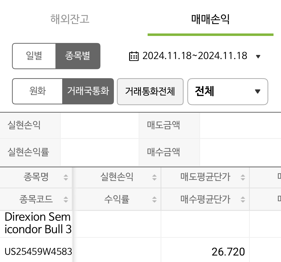 2024년 11월 25일 매매일지를 작성합니다.이번에도 매수 한 건이 있습니다.추가매수 건입니다.매수 _ SOXL얼마 전 포스팅에서도 올렸던 SOXL입니다.반도체 지수를 추종하는 3배 레버리지 ETF상품이죠.꾸준히 모아가는 종목 중 하나입니다.현재는 손실을 기록중입니다.한동안 엔비디아의 큰 상승기에는 플러스 40%를 넘나들었는데이렇게 보니 조금은 씁쓸하기도 하네요.하지만 반도체 시장의 분위기가 전환되는 순간 큰 상승을 보여줄 것으로 기대하기 떄문에비중을 조금씩 늘려가고 있는 종목입니다.현재는 분위기가 좋지 않죠.바닥구간에서 작은 움직임만 보여주고 있습니다.장기지표도 많이 낮은 구간에서 올라오지 못하고 있는 상태입니다.이제는 장기지표의 골든크로스가 나오는 시점을 확인 후에 추가매수를 고민해보려고 합니다.이..