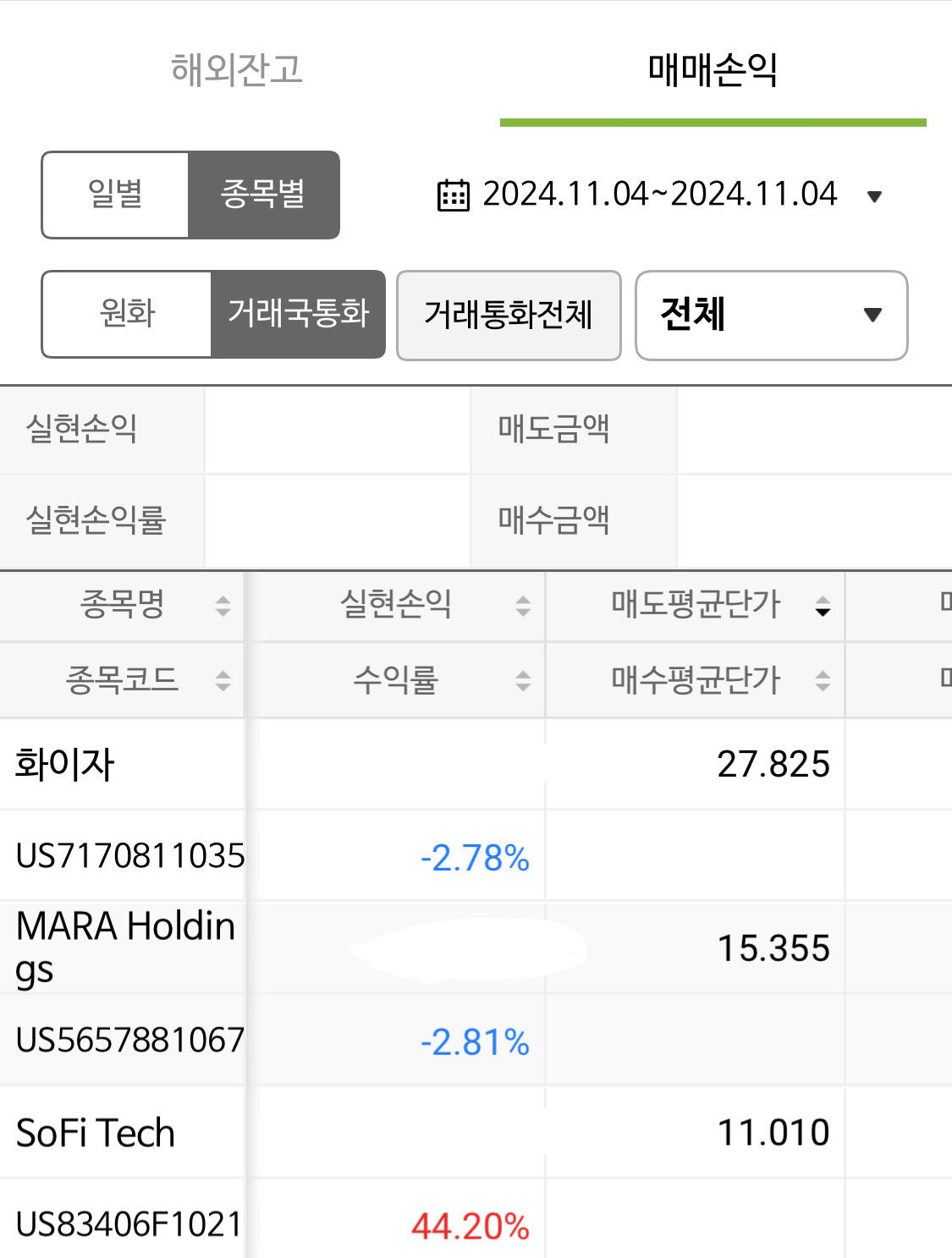 2024년 11월 4일 매매일지를 작성합니다. 이번 매매는 건수가 조금 많네요. 매도 3건, 매수 2건이 있습니다. 손절 2건과 익절 1건, 그리고 추가매수 2건입니다!먼저 매도 종목들입니다. 작은 손절 두건과 큰 익절 한건이 있죠. 익절이 큰 수익률을 기록해서 뿌듯합니다.매도1 _ 화이자(PFE)첫 번쨰 매도 종목은 화이자입니다. 큰 제약기업이면서 코로나 시기에 백신을 개발하면서 유명해졌죠. 장기적인 관점에서 매수했던 종목이지만 추세를 완전히 이탈해서 하락흐름을 만들어버렸고, 장기지표도 바닥을 향하는 흐름이라 매도를 결정했습니다.매도2 _ MARA Holdings(MARA)두 번째 매도 종목은 마라홀딩스입니다. 꽤 긴 시간 가지고 있는 종목인데요. 나쁘지 않은 자리에서 매수해서 큰 수익과 평타를 왔다갔..